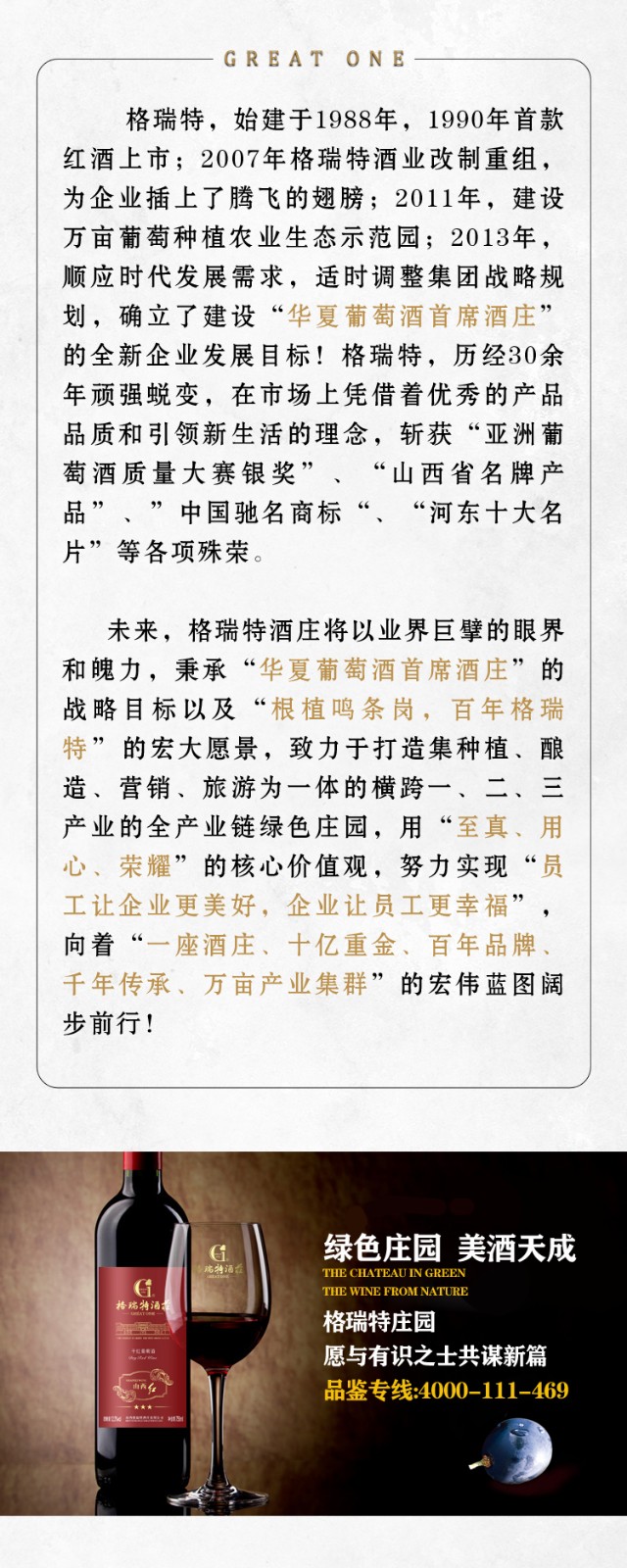 山西格瑞特酒莊有限公司成立于上世紀80年代,是一家集釀酒葡萄種植,釀酒生產,農業產業化,工業旅游化為一體
