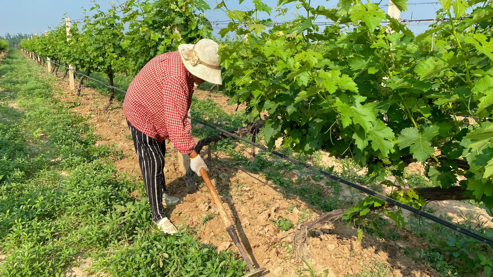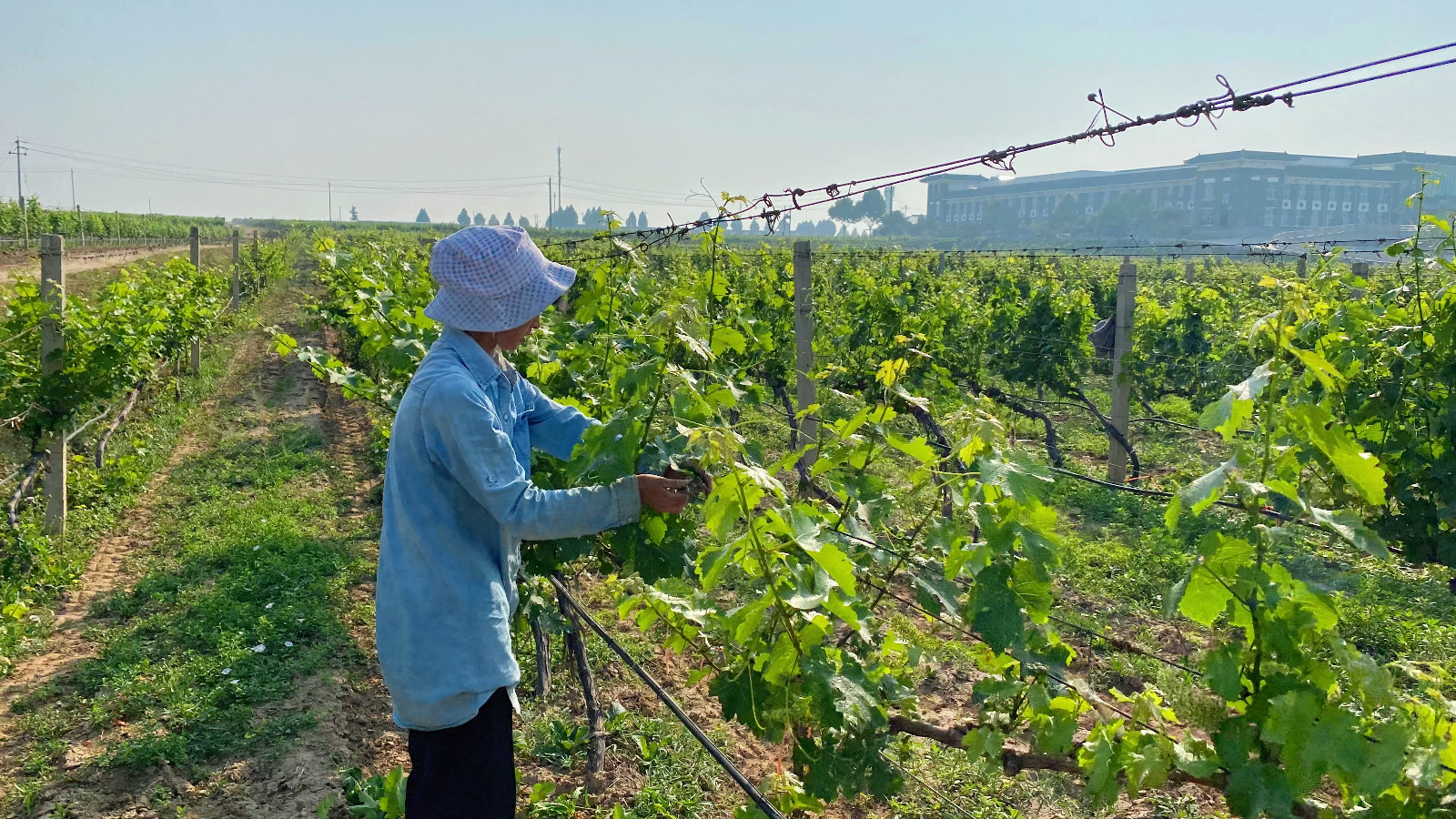 小滿時節,萬物生長最旺盛,此時格瑞特葡萄種植園,葡樹綠成碧浪,鳥聲和悅。工人們正在進行綠枝上架和鋤草兩項工作。將葡萄新梢通過雙絲攏梢技術攏入鐵絲中,均勻擺布到架面上,合理利用空間,有利于葡萄通風透光良好地生長。