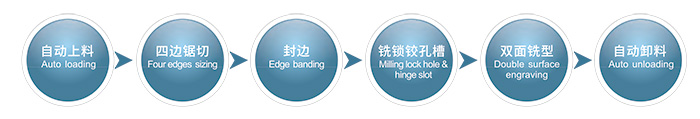 Flexible flush door leaf production line is based on automation standalone machines-continuous press machine,four edge saw,edge banding machine,on-line detection equipment,CNC lock hole and hinge slot machine,double surface engraving machine,CNC short edge processing machine,etc.adding accessory units such as loading & unloading manipulator,on-line storage,and transit,positioning,rotate conveyors.The main parameter,speed,automation structure,control method are consistent and interrelated,material logistics & information flow synchronously transmitted.Automatically identify,regulate & machining door leaf with different specifications to satisfy customized production demand of "batch & quantity consistent" and unmanned operation.It could be customized according to user's production craft,workshop layout and production capacity etc.