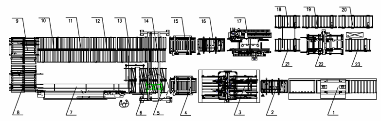 8.封邊出料臺 9.封邊出料臺 10.單向輸送臺II 11.單線輸送臺II 12.單向輸送臺II 13.單向輸送臺II 14.單向輸送臺II 15.周轉庫 16.掃描臺II 17.數控門扇孔槽加工機 18雙向輸送臺 19.單向輸送臺I 20.單向輸送臺I 21.雙向輸送臺 22.雙面加工中心 23.單向輸送臺I
