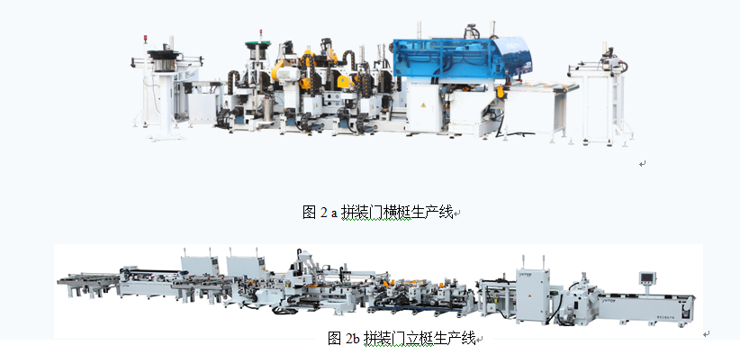 近年來,國內裝備制造領先企業與木門骨干企業積極合作,通過改進工藝,使拼裝門制造更適合自動化加工,先后開發出橫梃、立梃、門芯板、線條等拼接門組件的自動加工生產線,如圖2a、2b所示。